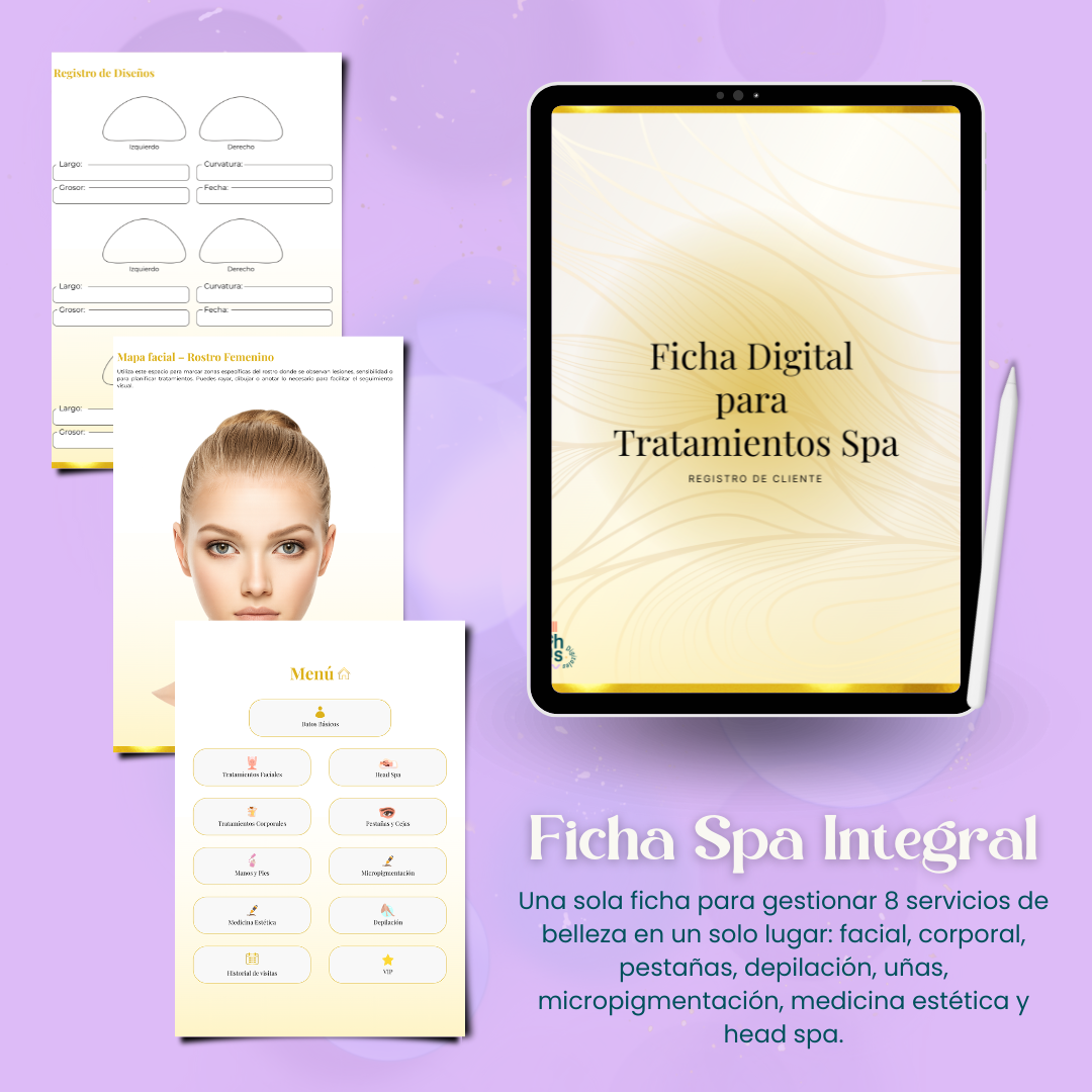 La Ficha Integral 8 en 1 reúne en un solo archivo todo lo que necesitas para registrar y gestionar tus servicios: facial, corporal, pestañas y cejas, uñas, micropigmentación, medicina estética, depilación láser y head spa.